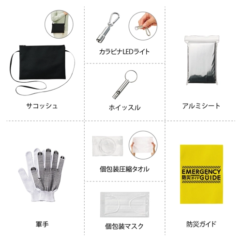素材:サコッシュ/ポリエステル 他・LEDカラビナ付ライト/アルミ 他・ホイッスル/アルミ 他・軍手/コットン、ポリエステル 他・アルミブランケット/アルミ蒸着PET・圧縮タオル/レーヨン・マスク/不織布(PP)・防災ガイド/紙