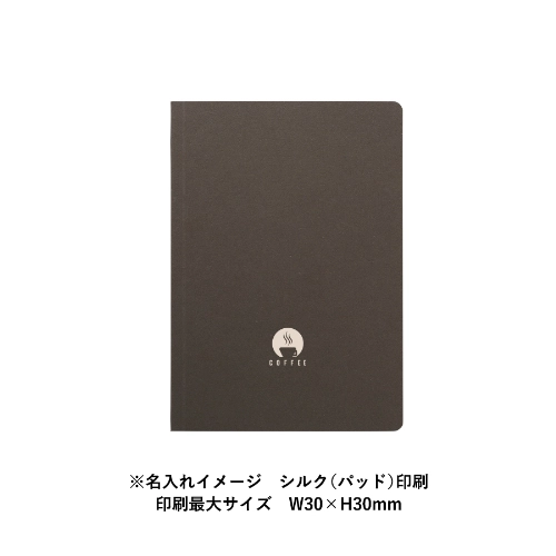 色名にも入っているコーヒー・チェリー・シトラス・ラベンダーのボタニカル素材をそれぞれ表紙に使用し、 中のノート紙は再生紙70%の物を使用しているため、環境にもやさしいアイテムです。 また、既存のリサイクルノートにあった製本テープがなくなり、 見た目の一体感が生まれて、よりスタイリッシュな印象になりました。 表・裏の2ヶ所に広い範囲への印刷が可能なため、オリジナリティの高いグッズを作成できます。